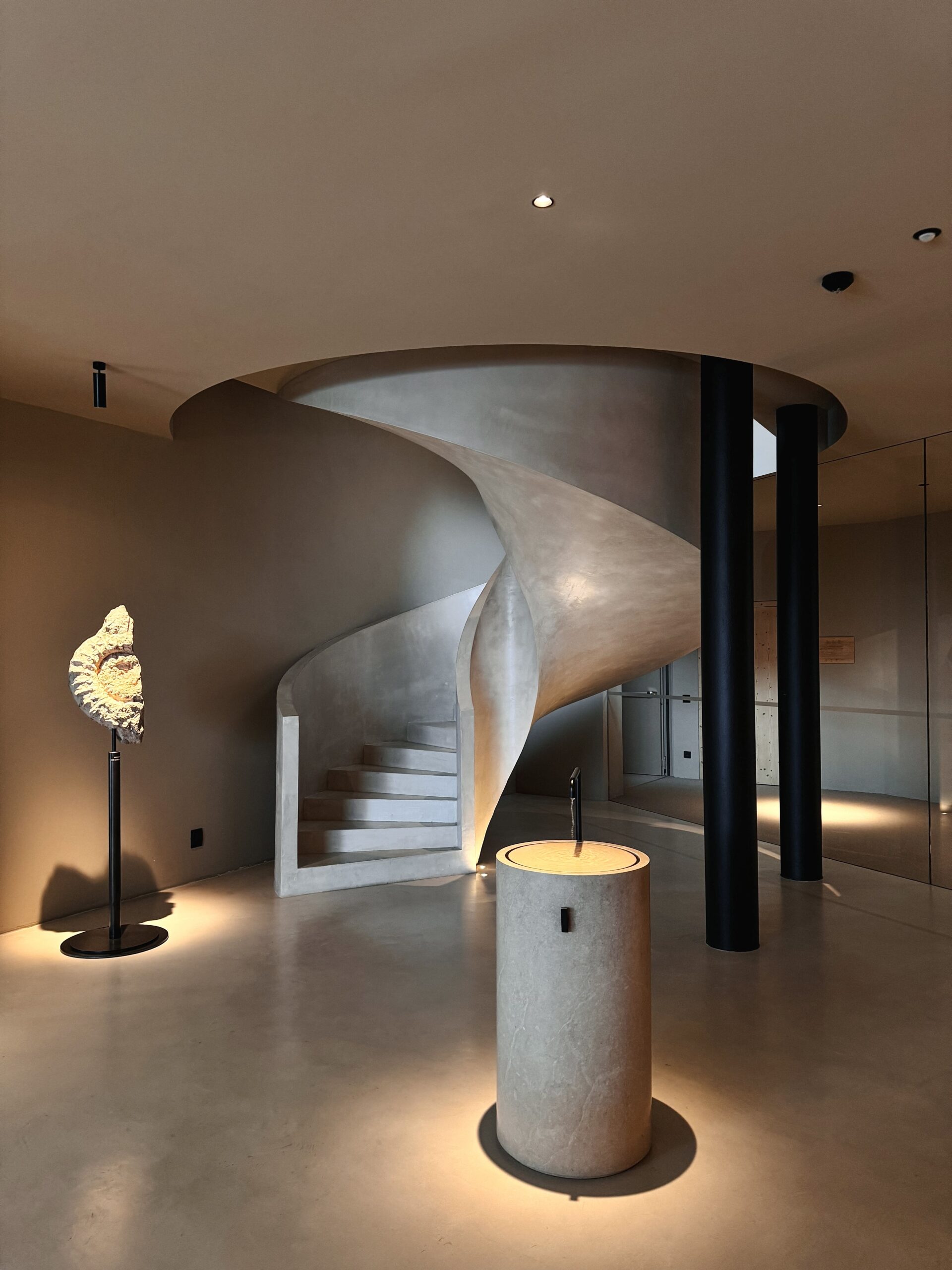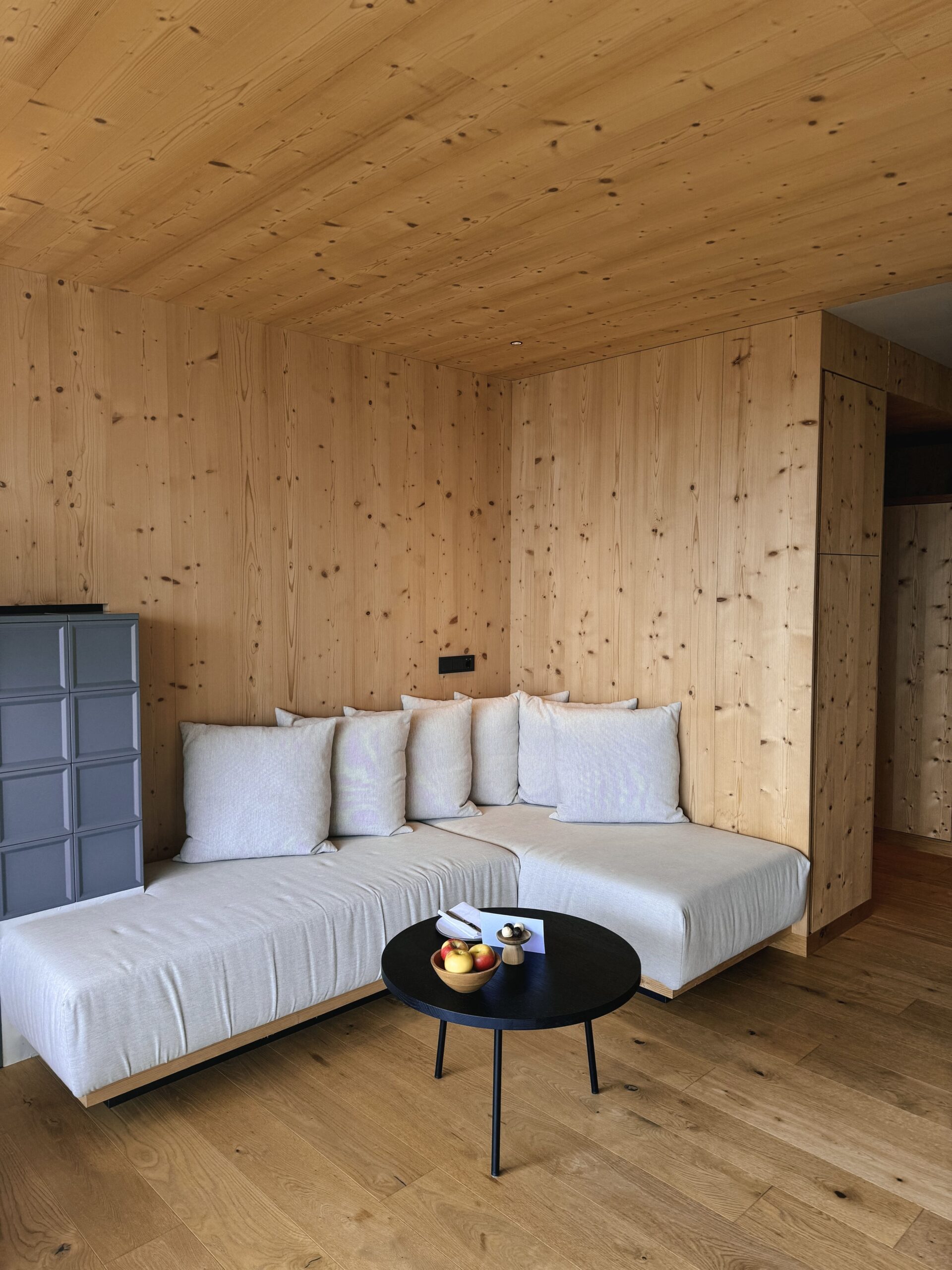 If you want to see any scenery, go for the ‘Tower Suite’. What the room lacks in size, it makes up in its panoramic rooms and its soothing alpine design. Once you open the curtains, you’ll be looking over scenic mountain views while still laying in bed. Every room comes with its own spacious terrace, which has its own daybed where you can lounge, read or take photos in wrapped in a big, cosy blanket. The bathrooms come in soothing light beige-grey flooring, with distinct black accents on faucets and more. It also comes with a picturesque bathtub.